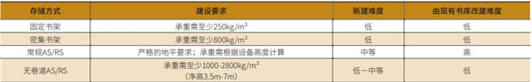 由此可见,新建常规AS/RS的难度要显著高于其他几种存储方式。此外,受制于既定书库净高,利用现有库房条件改造成常规AS/RS较为困难且不够经济。因此,建设常规AS/RS应当在新馆或新库建筑设计前就已将规划纳入其中。