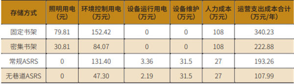 无巷道AS/RS设备用电为机器人以及服务器系统运营,根据设备供应商估算,100万册藏书量的库房一天需约耗电60度,即60/kW·h,故设备运行电力成本为:60/kW·h×1元/kW·h×365天=2.19万元。